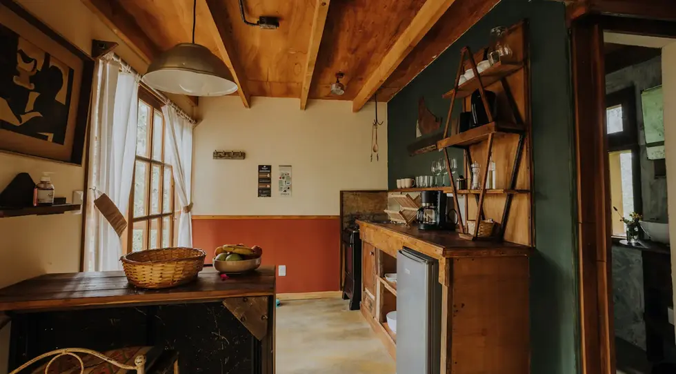 Cuenta con aire acondicionado y un living acogedor en el que la cocina está equipada con cocina completa, jarra eléctrica, tostador y cafetera, además de tener en el mismo espacio la estufa a leña.